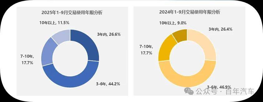 1-9月,二手车使用年限在3-6年的交易量最多,占比为44.2%,较去年同期下降2.6个百分点;