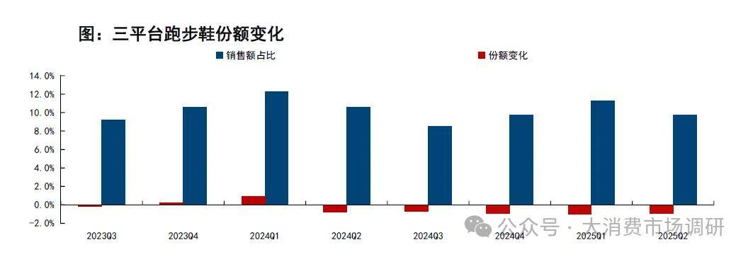 ① 跑步鞋2025Q2销售额占比9.7%,同比变动-0.9个百分点;