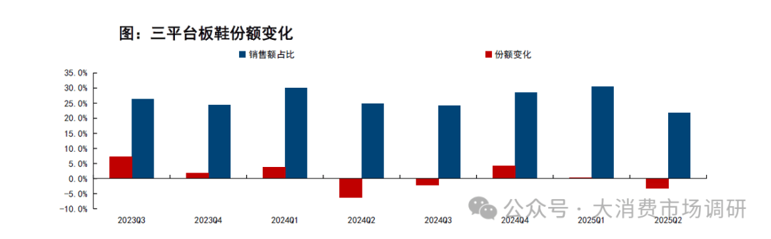 ① 板鞋2025Q2销售额占比21.7%,同比变动-3.2个百分点;
