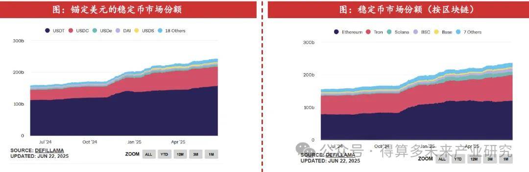 其中锚定美元的稳定币市值超过2420亿元美元。根据The Block数据,截至6月22日,USDT占比64.7%,USDC占比25.1%,USDe占比2.3%,DAI占比1.8%,USDS占比1.7%