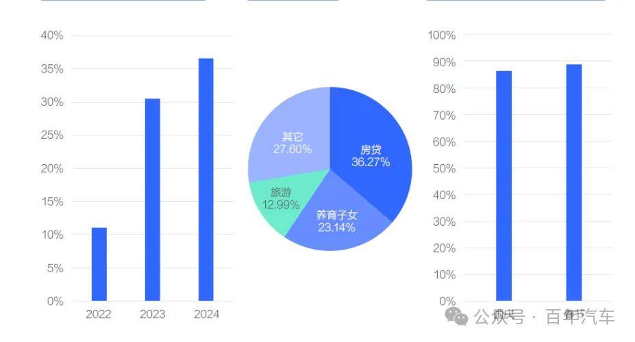 疫情后,中国购车家庭的旅游消费快速活跃,2024年超过35%的购车家庭的旅游支出超过15%,当年旅游支出占家庭总支出的比例逼近13%;
