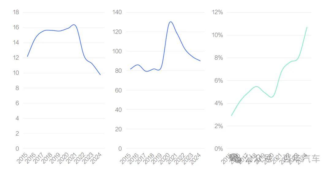 家庭主要支出在哪里,车市主要消费就在哪里。过去二十年,中国购车家庭的主要开支在孩子结婚,围绕孩子结婚衍生出的婚车市场成为中国车市消费的主体,成就了朗逸、轩逸、哈弗H6、悦动、英朗等一大堆适合青年家庭结婚的优秀产品,期间合资车企成为最大受益者。近五六年,青年结婚不断减少,疫情来势汹汹,导致曾经适合青年家庭与结婚诉求的绝大多数热销产品不热销,中国婚车市占率快速萎缩,由2016年30%多降至2024年不足12%;