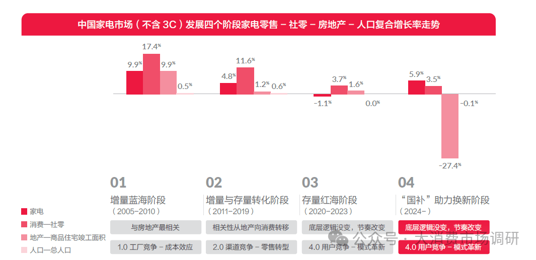 4. 第四阶段:用户竞争时代(2024 年开始)。步入2024 年,家电产业开启用户竞争时代。在这一时代,消费者需求更加多样化、个性化,对家电产品智能化、集成化、健康化、绿色化等方面提出更高要求。同时,随着互联网技术发展,消费者获取信息渠道更加多元,消费者决策更加理性。家电产业的竞争不再仅仅局限于产品、渠道与品牌,而是深入到用户层面。无论是品牌商还是渠道商,都将重心放在了用户的经营上,由此称之为用户竞争时代。