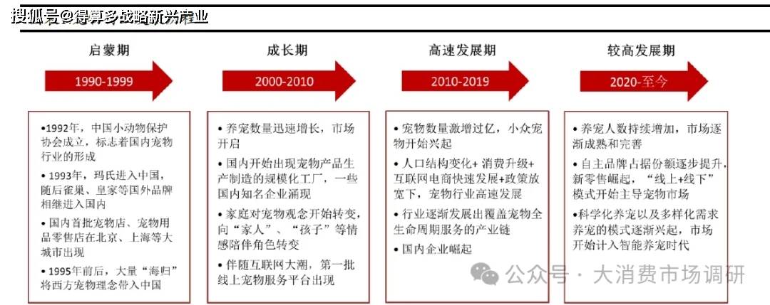 我国的宠物产业起步较晚,但发展迅速,经过30多年的发展,目前处于较高发展期,自主品牌份额逐步提升。宠物产业是指所有与宠物相关的行业,宠物产业链包括宠物饲养、宠物食品、宠物用品、宠物医疗、宠物美容、宠物培训、宠物保险以及宠物善终等。我国宠物行业的发展时间较短,但受益于国民经济的发展和消费转型升级,近年来国内宠物市场规模出现了快速增长趋势。结合中国经济发展的阶段性,可以把宠物行业的发展大致分为四个阶段。