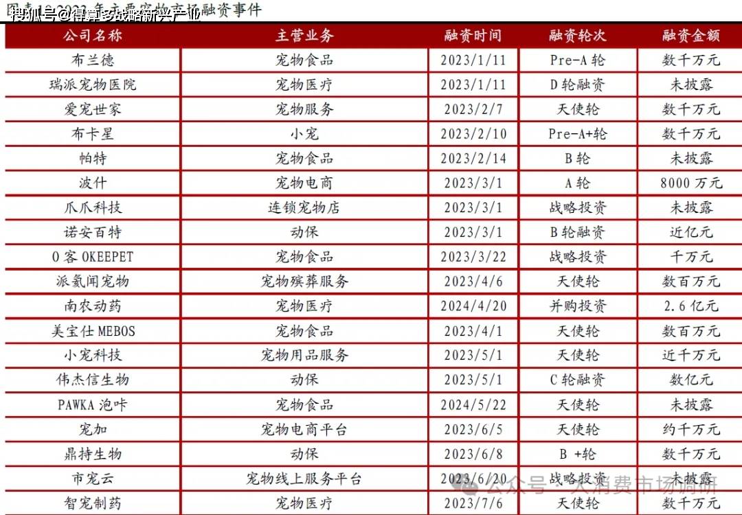 2023年,宠物融资市场中,宠物食品获投6起,宠物医疗获投10起,宠物用品获投7起,宠物服务(供应链、殡葬、电商等)获投5起,其他领域(小宠、连锁宠物店、宠物展会、宠物公益等)获投5起。披露金额的融资事件中,过亿融资3起,分别是宠物家、南农动药,动保企业伟杰信生物;此外还有近亿元融资4起、数千万元融资8起、千万元融资4起。