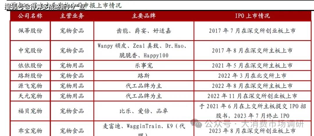 宠物行业近年开启上市潮,目前国内一共有7家宠物主业上市公司。最早在A股上市的宠物公司是2017年7月在深交所主板上市的佩蒂股份,为A股宠物第一股,同年8月中宠股份也在深交所上市3。年此没后有新的宠物行业公司上市,直到2021年开始每年都有新的公司上市,当年5月依依股份在深交所主板20上22市是。宠物行业上市大年,先后有3家企业成功上市:3月路斯股份登录北交所,成为北交所宠物第一股;8月源飞宠物正式登录深交所;11月天元宠物登陆创业板。2023年上市热潮有所降温,只有1家企业成功上市,8月乖宝宠物在深交所创业板上市。此外,2023年7月,曾计划在上交所主板上市的福贝宠物IPO被终止。