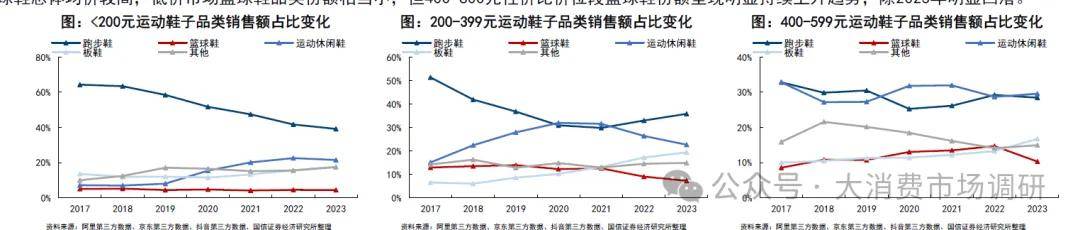 •高端市场板鞋、篮球鞋份额提升明显,但2023年篮球鞋在多个价位段份额同步下降,板鞋继续保持明显上升势头。