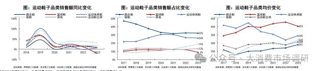 结论2:疫情前运动休闲鞋对跑鞋替代明显,疫情后跑鞋趋势企稳,各品类除运动休闲鞋外均价均持续提升,2023年篮球鞋价格高位回落