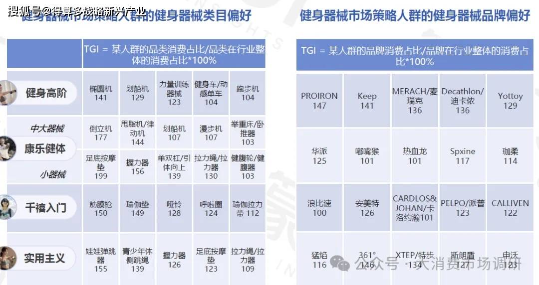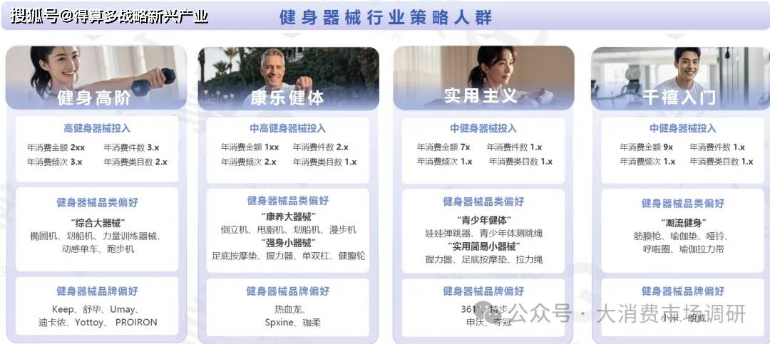 健身高阶在健身器械消费深度,购买频次高且购买品类多,为市场的高阶人群;康乐健体关注自身身体,购买品类数也相对丰富。
