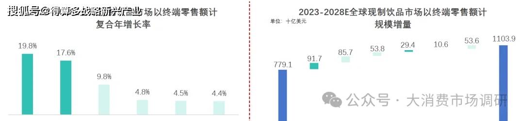➢ 全球现制饮品市场规模巨大并且未来预计将呈现加速增长态势。以终端零售额计,全球现制饮品市场规模从2018年的5,989亿美元增长至2023年的7,791亿美元,复合年增长率为5.4%。2023年至2028年的复合年增长率预计将进一步提高至7.2%,带动市场规模增长至2028年的11,039亿美元,占据全球饮料市场近一半份额。
