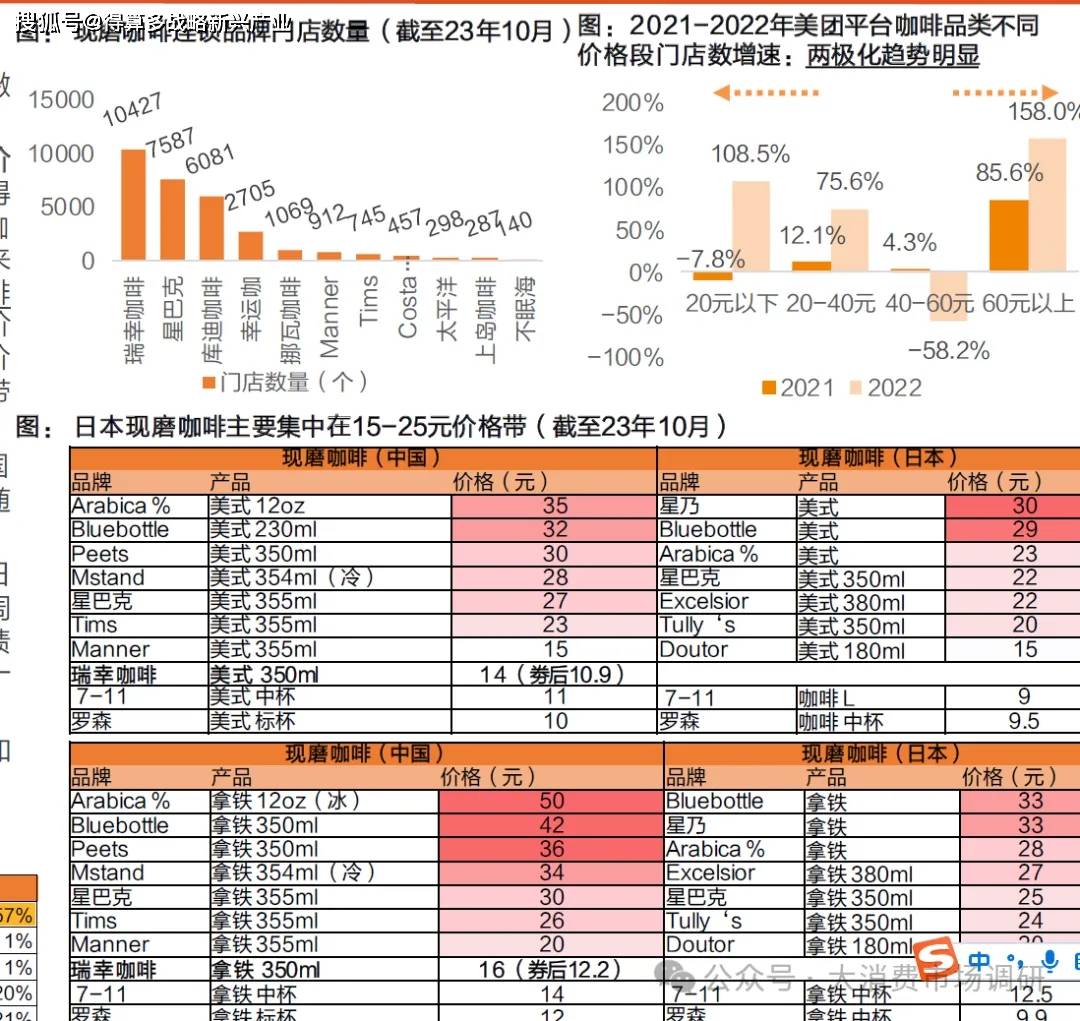 ● 咖啡价格段两极化,瑞幸所处价格带有望持续拓展。3)价格:我们选取中日咖啡市场主要品牌的基础咖啡价格做对比得到如下结论:A、日本现磨咖啡整体价格低于中国。从精品咖啡如arabica、blue bottle,连锁咖啡如星巴克的拿铁定价来看,中国/日本定价倍数分别为1.8/1.3/1.2;B、日本现磨咖啡中等价格带竞争更激烈。日本美式咖啡价格基本在20-23元价格带,拿铁价格在24-28元价格带竞争;而中国咖啡市场定价更分散,美式价格在23-30元价格带,拿铁在26-36元价格带竞争。