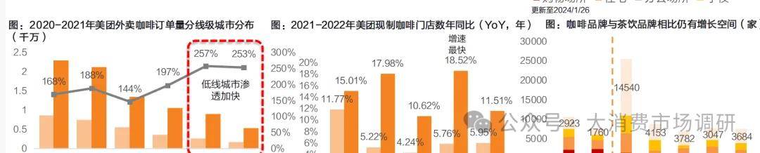 连锁咖啡门店集中在高线城市,下沉市场仍具开拓空间。 根据艾瑞咨询数据, 2022年中国约有 2.3 万家连锁咖啡店,其中 70% 位于一线及新一线城市。同时,根据美团外卖数据显示, 22 年三线城市咖啡订单量同比 21 年增长接近 2 倍,四五线城市咖啡订单同比增长 250% 以上。我们认为,相对于发展较为成熟的茶饮赛道,咖啡赛道目前还有不少点位待开拓,咖啡在下沉市场仍具开拓空间。 根据极海数据,瑞幸咖啡在三线及以下城市一公里内至少有 2 家门店比例为 44% 61%61%,蜜雪冰城在三线及以下城市一公里内至少有 2 家门店比例均超过 65%65%,瑞幸咖啡在低线城市仍具加密空间。