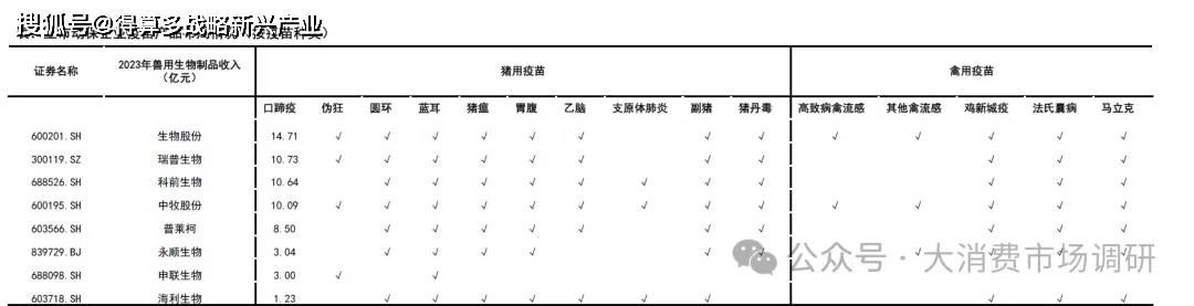Ø 另外在猪伪狂犬病、猪圆环病毒等非强制免疫疫苗领域具备优势的科前生物、普莱柯同样具备较大收入规模,2023年分别为10.64亿元、8.50亿元。