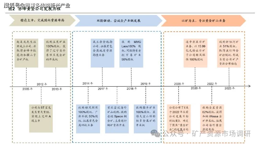 战略变革完成蜕变,锚定黄金主业,矿产资源储备不断提升。赤峰黄金成立于2005年,创始人赵美光先生通过购入赤峰市红花沟金矿和撰山子金矿采矿权,切入有色矿产资源开发行业;2012 年公司借壳ST 宝龙实现上交所上市;2013 年收购辽宁五龙金矿,形成公司目前国内金矿资源基本格局。2014-2019 年期间,公司制定并执行“采矿业与资源综合回收利用业务双轮驱动”的战略方向,尝试建立全产业链发展的有色金属矿业公司。2014 年收购雄风环保,拓展有色金属回收业务;2017 年成立赤金地勘,拓展有色金属地质资源勘查业务;2018 年收购老挝Speon 铜金矿,填补公司海外矿业资源空白,2020 年之前主要进行铜矿资源开采;2019 年收购瀚丰矿业100%股权,获得天宝山锌铅钼多金属矿的开采权;2020 年,公司战略方向出现重大转向,新任管理层提出“以矿为主,专注黄金矿山业务”,将公司主营锚定于贵金属资源开采和利用上。为了贯彻公司战略,2020 年开始逐步剥离非矿业务,当年即以15.99 亿元转让非矿子公司雄风环保100%股权;2022 年收购金星资源62%股权,获得了加纳Wassa 金矿开采权;2023 年收购新恒河矿业51%股权,取得云南溪灯坪金矿控制权,形成了当前公司矿产资源分布格局。
