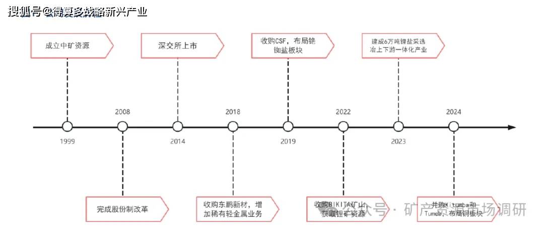 公司已 由地勘公司成长为矿产资源产业链 一体化 的矿业集团化企业 并 完成锂、铯铷、铜三线布局。 公司成立于 1999 年,后于 2014 年在深交所上市。公司立足国内 及 海外 的 固体矿产勘探技术服务,先后承接了中国有色赞比亚谦比希铜矿、中冶集团巴布亚新几内亚瑞木镍钴矿、中冶集团 和江西铜业阿富汗艾娜克铜矿、北方工业津巴布韦铂钯矿和刚果(金)科米卡铜钴矿、紫金矿业刚果(金)卡莫阿铜矿等国际重大项目,逐步形成全球化地勘业务布局。 2018 年公司收购东鹏新材,布局锂及铯铷盐冶炼业务,并通过包销协议锁定津巴布韦 Bikita 矿山铯榴石原料。 2019 年通过收购美国 Cabot 特殊流体事业部旗下 Tanco矿山及其英国铯回收加工厂,公司拥有了全球最大铯榴石矿山,并得到甲酸铯生产能力及超 3 万 BBL 的甲酸铯库存。 2022 年公司收购津巴布韦 Bikita 矿山,保障上游锂矿资源,并于 2023 年建成 6 万吨锂盐 采选冶上下游一体化产业链。 2024 年公司并购赞比亚 Kitumba 铜矿和 Tsumeb 铜冶炼厂,完成铜板块布局。据公司 202 5 年 半 年报,公司在海内外拥有参控股子公司 20 多家,公司及所属子公司共计拥有各类矿业权 73 处,其中采矿权 15 处、探矿权 44 处、地表租约 14 处。公司已成长为拥有矿产资源全产业链的矿业集团化企业 。