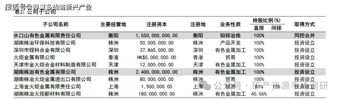 公司是国内锌冶炼龙头,有完整的产业链,是一家集铅锌等有色金属的采选、冶炼、销售为一体的综合性公司。公司前身为1956 年始建的株洲冶炼厂,业务为锌冶炼;2023 年公司通过发行股份及支付现金方式购买水口山集团持有的水口山有限100.00%股权,发行股份方式购买湘投金冶持有的株冶有色20.8333%股权,2023年2 月10 日完成重组,自此新增铅锌矿山和铅冶炼业务,冶炼环节中综合回收铅、铜、镉、银、铟、汞等有价元素。