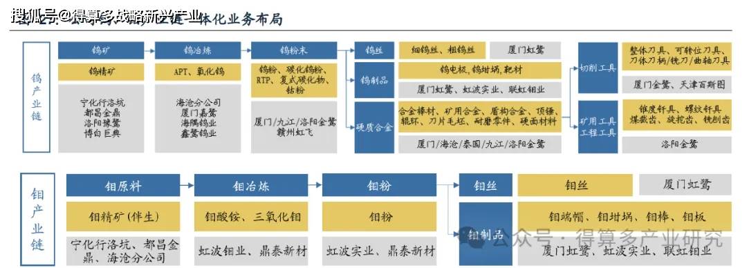目前,公司布局钨钼、稀土、新能源材料并实现各自产业链上下游延伸:(1)钨钼:构建从前段钨矿山采选,中端钨钼冶炼及钨钼粉末生产,到后端硬质合金、钨钼丝材制品、切削工具、矿用工程工具等高端深加工应用及回收全产业链;(2)稀土:建立包括稀土采选、稀土冶炼分离到稀土深加工产品的完整产业链,形成以深加工带动产业发展的稀土开发模式;(3)新能源材料:构建全面的产品线——钴酸锂、三元材料、氢能材料、磷酸铁锂等。产品广泛应用于汽车、机械、军工、新能源、化工、船舶制造、航空航天等领域。