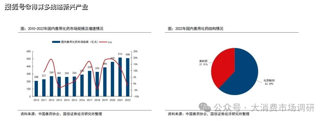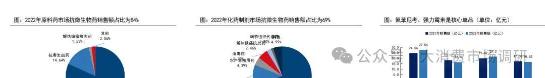 Ø 抗微生物药是国内兽用化药市场的核心构成,2022年国内兽用原料药市场和兽用化药制剂市场中抗微生物药的销售额占比分别为82%、69%。