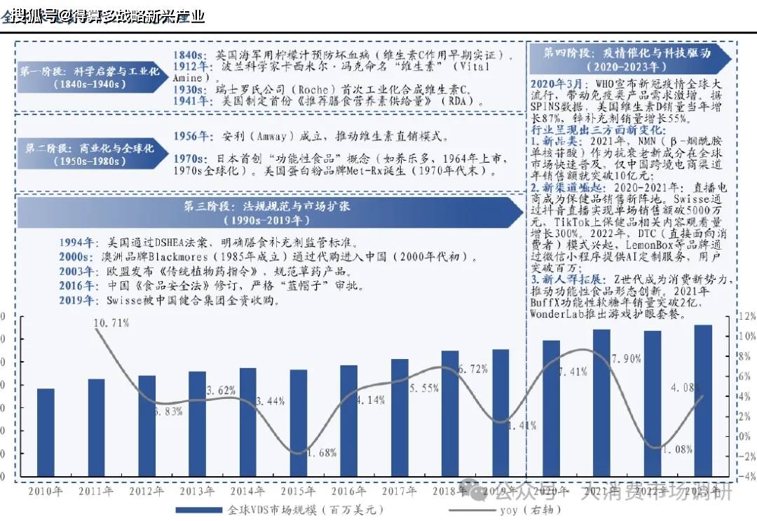 全球保健食品行业增速趋稳。维生素和膳食补充剂(Vitamin&DietarySupplement,简称VDS)的商业化起源于20世纪30年代,纽崔莱推出首款植物基维生素补充剂。近年来随着发达国家老龄化、健康认知升级,以及新兴市场逐步贡献增量,全球VDS市场规模由2010年的770.11亿美元增至2023年的1324.14亿美元,CAGR为4.26%,增速趋于稳健。