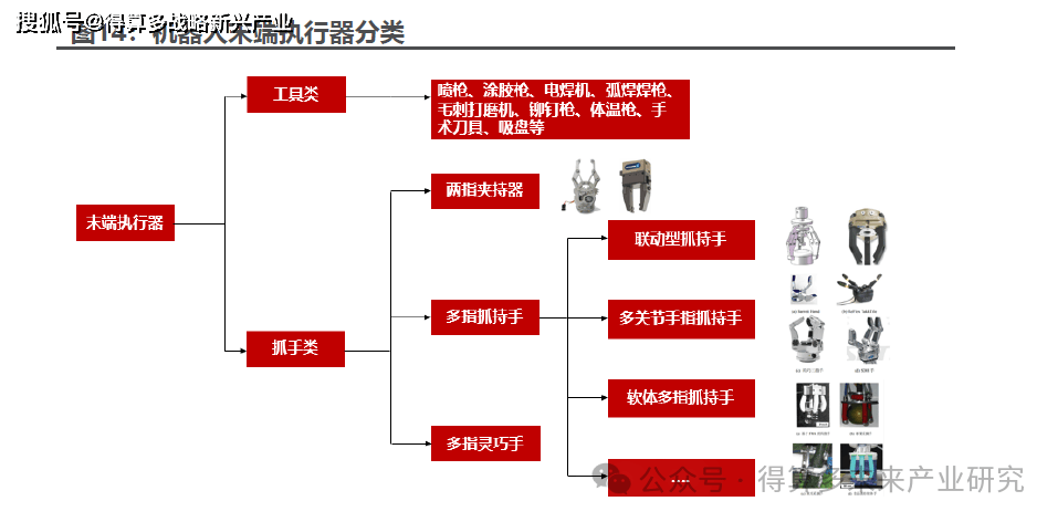 一般而言,机器人与环境交互的方式主要包括:移动行走、视觉等信息的获取和决策的执行输出,其中操作和动作决策的执行输出工具在机器人学领域中被称为末端执行器。末端执行器系机器人执行部件的统称,一般安装于机器人腕部末端,按其功能可以分为工具类和抓手类两种。工具类末端执行器是根据具体工作需求专门设计并预留标准化接口的机器人专用工具,包括:喷枪、涂胶枪、电焊机、弧焊焊枪、毛刺打磨机、铆钉枪、体温枪、手术刀具、吸盘等;抓手类机器人末端执行器则类似于人的双手,负责执行各种动作、抓持和操作的任务,包括:两指夹持器、多指抓持手以及多指灵巧手。