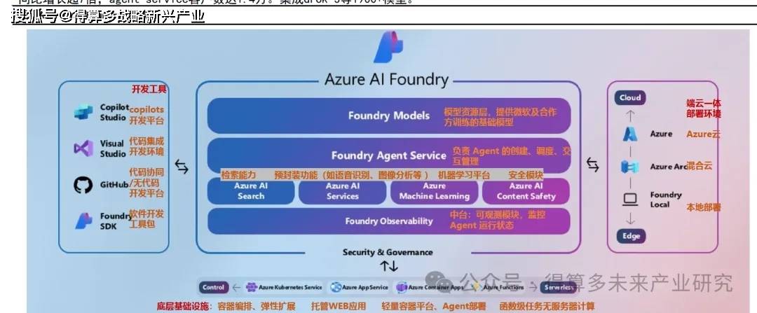Azure AI Foundry:构建企业级 AI 模型与智能体全生命周期管理体系。已被80%的财富500强企业使用,25Q2处理的tokens超500万亿,同比增长超7倍,agent service客户数达1.4万。集成Grok-3等1900+模型。