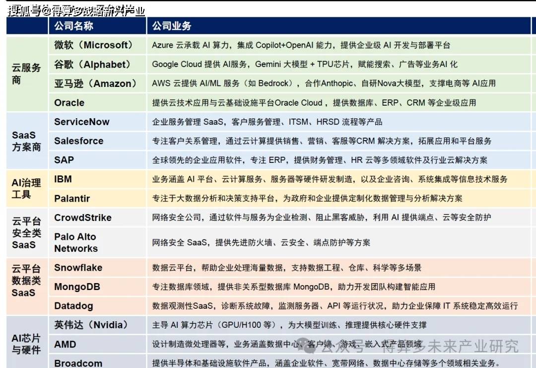 ① 第一层(核心):生成式AI模型供应商+云服务商(算力) → 抢大脑;
