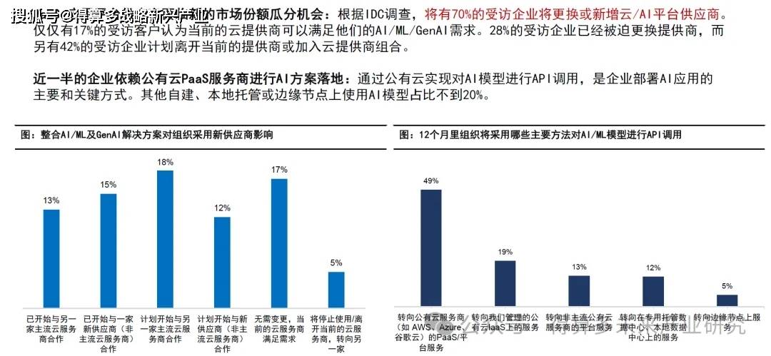 •能帮助企业实现AI目标的供应商中云服务商(49%)碾压式领先,反映出AI应用依赖于AI平台,而AI平台=云算力+开发平台+生态的建设逻辑。