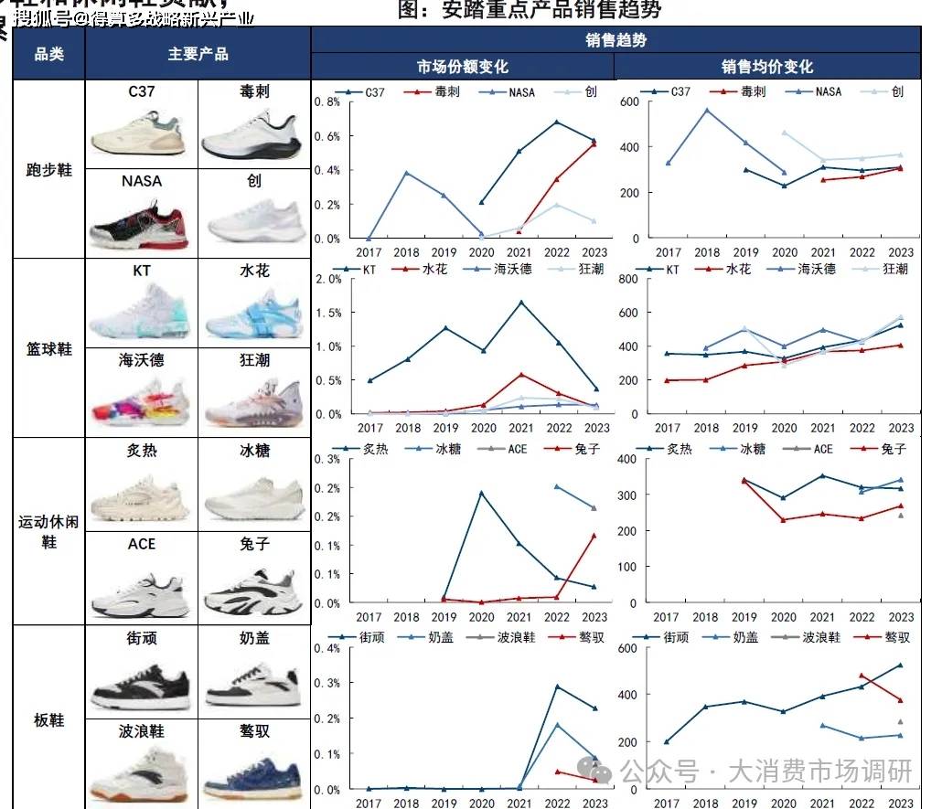 • 跑鞋方面,2019-2023年市占率整体上升,近年新推出的全能型进阶跑鞋毒刺、创可以用作日常训练、比赛和恢复跑等多种场景,分别使用ASHOCK缓震中底和超临界氮科技中底,份额提升较多。2020年推出的休闲跑鞋C37,穿着舒适且设计时尚,成为性价比高的爆款,份额提升较多,毒刺、创、C37单价均有一定程度提升。NASA是安踏与美国航空航天局NASA联名推出的系列,2021年后NASA系列不再在官方渠道销售。