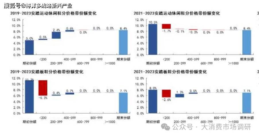 •运动鞋份额变化分价格拆解:中低价格带份额比2019和2021年提升,腰部及中低价格带份额比2022年均有下降。最大占比的价格带为200-399元,随着品牌升级推进,200元以下占比大幅缩小。从份额贡献看,200-399元贡献主要的份额提升,但是2023年200-399元价格带行业竞争较为激烈,即使这一价格带占比提升但对份额贡献相对负面。