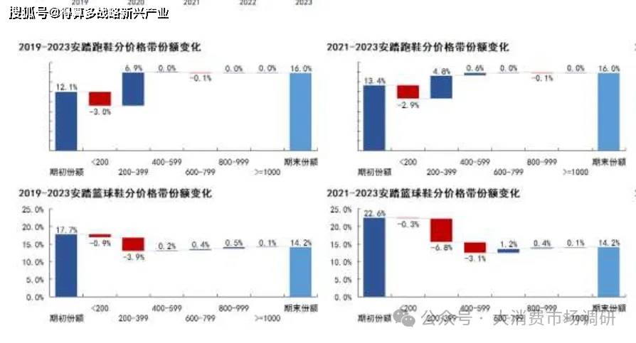 1.跑鞋份额变化分价格拆解:200-399元占比最大且贡献份额提升。2023年跑鞋价格带占比最大是200-399元,占比62%。2023年安踏跑鞋份额16.0%,相比2022年稳定,比2019年和2021年均有较明显提升,其中,200-399元价格带的增长是份额提升的主要驱动力,200元以下份额下降较多,其他价格带占比低于10%,对份额影响小。