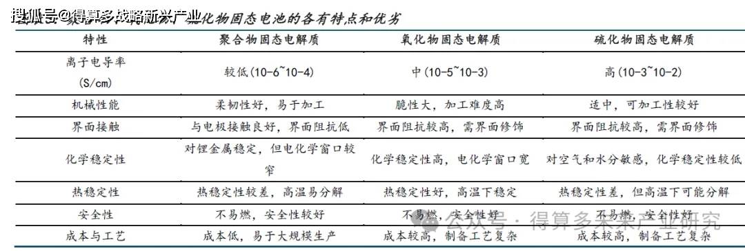 固态电解质分硫化物、氧化物、聚合物等,硫化物的最大优势在于高电导率。硫化物固态电解质硫化物固态电解质在室温下展现出最高的电导率,电化学稳定窗口宽广,同时兼具优异的机械性能和延展性,界面相容性问题较少,因此被视为理论上最理想的固态电解质材料,然而硫化物热稳定性差、热反应起始温度高以及与正极材料兼容度低等问题,仍制约着其大规模应用;聚合物电解质在加工性和界面兼容性上占优,但电导率和稳定性有待提高;氧化物电解质在热稳定性和电化学窗口上表现突出,但界面接触和成本问题仍需解决。