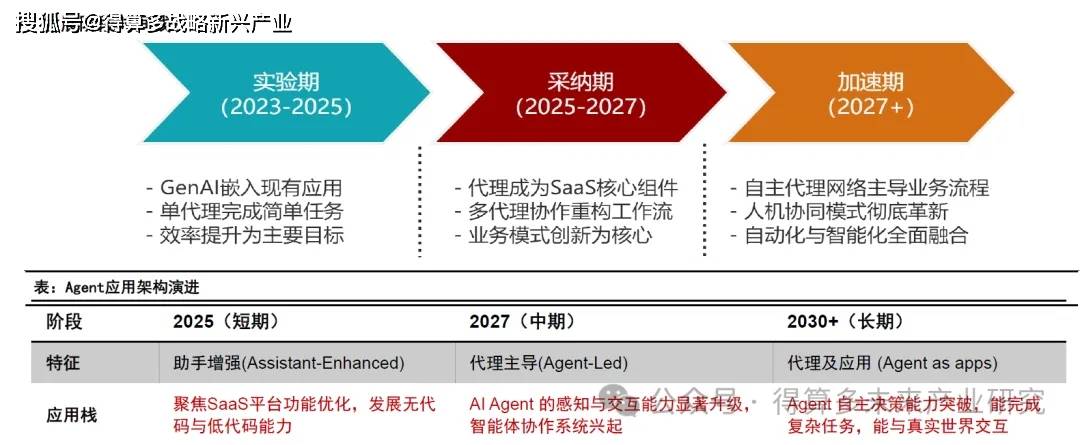 未来10年,企业应用智能体化演进将从功能增强逐步迈向由智能体主导,2037年“智能体即应用”将成为主流。