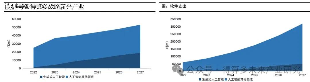 IDC发布的2024-2028年全球人工智能IT支出预测显示,2023-2028年全球人工智能IT支出呈现持续增长态势,总市场的复合年增长率(CAGR)为22.3%。过去两年AI已从“概念”进入“真金白银投入”,且呈现爆发式增长。其中GenAI的CAGR为73.5%(GenAI信息创建,如文本、音频、视频、图像和代码生成相关),其余AI的CAGR为22.3%(Rest ofAI,主要为解释性AI以及预测性/规范性AI)。