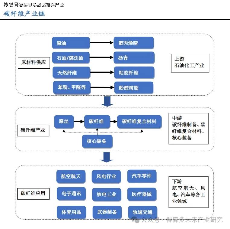 碳纤维产业链主要包括从上游碳纤维原料供应到中游碳纤维制备、碳纤维复合材料以及配套设备及下游应用行业。
