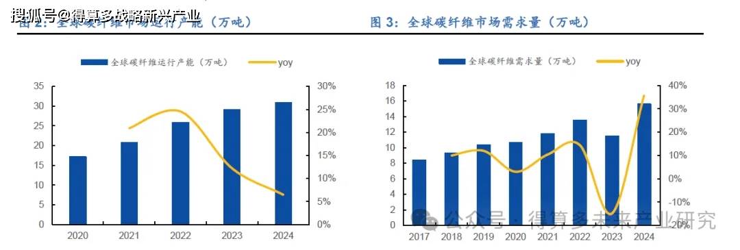 2024年,全球碳纤维市场呈现出供需两旺且格局变动的态势。从需求侧来看,2024年全球碳纤维需求达156,100吨,较2023年的115,000吨同比大幅增长35.7%。从供给侧来看,2024年全球碳纤维运行产能从2023年的290,230吨增长至309,000吨,增幅达到6.5%。
