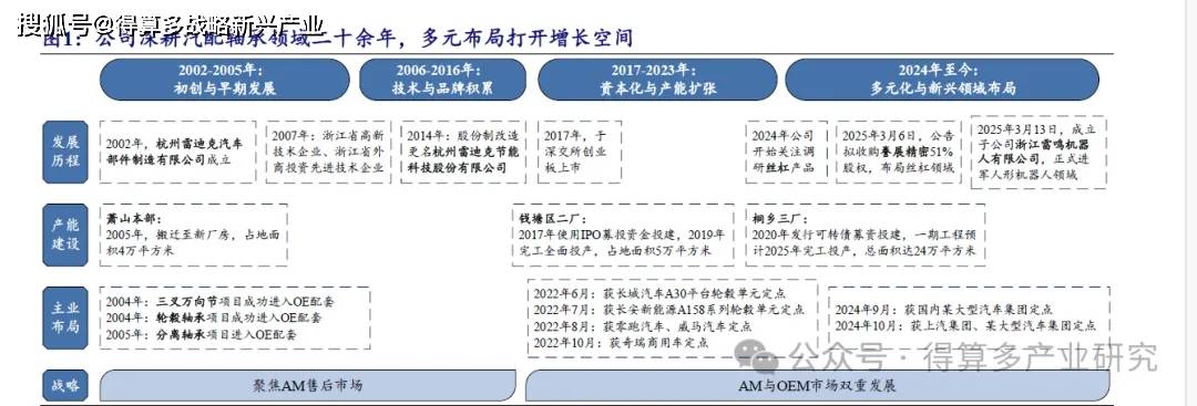 雷迪克成立于2002 年,深耕汽车轴承配件领域二十余年,客户覆盖上汽、奇瑞、长安等主流车企。公司于2002 年在杭州萧山成立,于2017 年在深交所创业板上市,设有萧山本部、钱塘区二厂、桐乡三厂基地。早期业务布局聚焦于AM 售后市场,2017 年以后拓展OEM 整机市场颇具成效,获上汽、奇瑞、长安等主流车企轮毂单元产品定点。2025 年3 月,公司拟收购誊展精密部分股权、成立机器人子公司,进军人形机器人领域,开拓多元化发展时代。