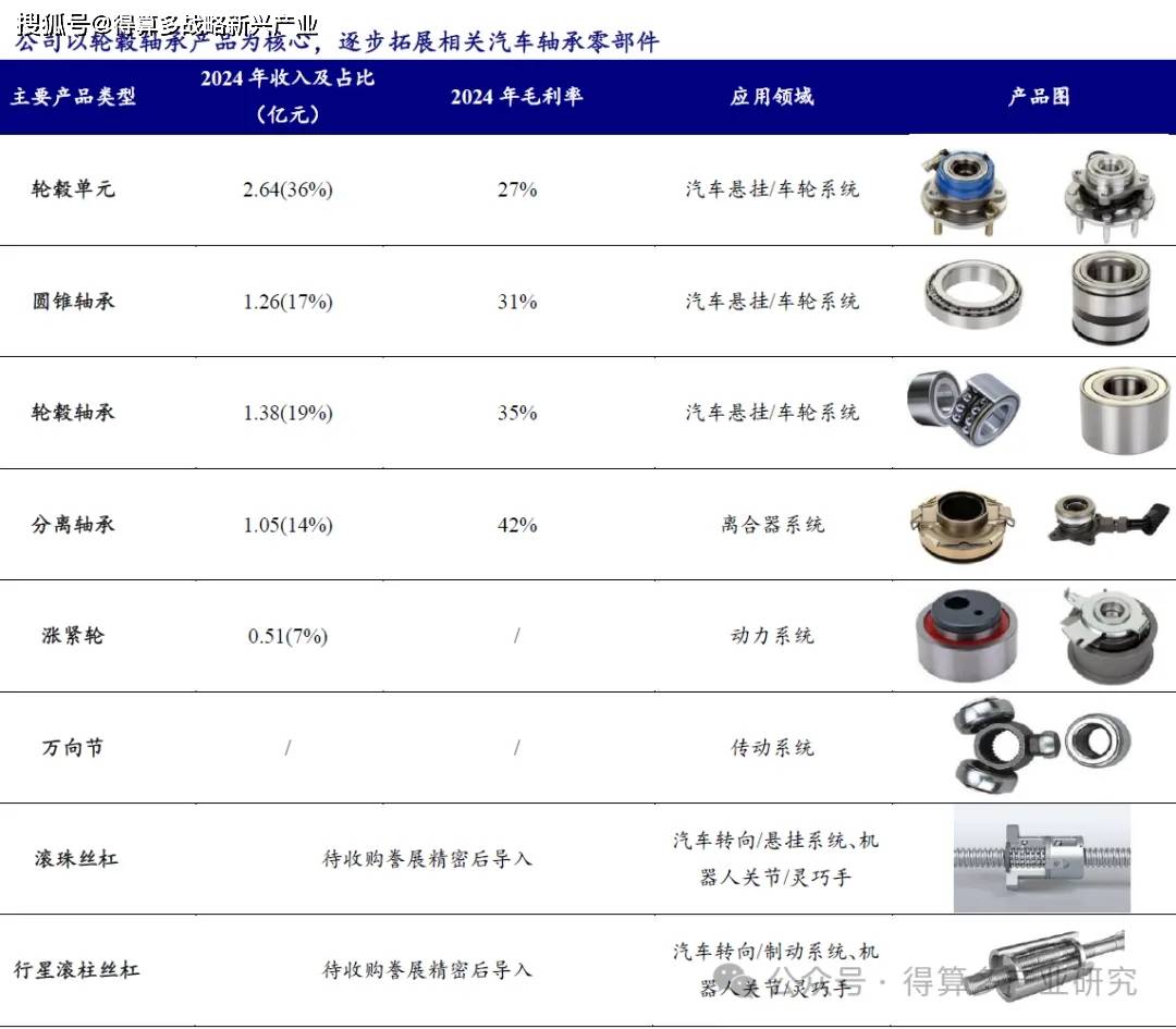 公司产品主要包括轮毂轴承、轮毂轴承单元、圆锥轴承、离合器分离轴承、涨紧轮等,下游主要为汽车悬挂系统、动力系统和传动系统等。待收购誊展精密后,公司有望凭借在精密零部件加工领域的积累,导入滚珠丝杠和行星滚柱丝杠产品。
