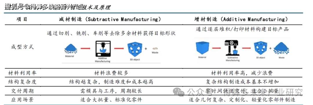 3D 打印技术又称增材制造技术,是以三维数字模型 为蓝本、逐层叠增材料成型 ,融合了信息技术、先进材料与数字制造技术。 相较传统切削去料的减材路径,增材制造通过自下而上的堆叠方式 能够 省去模具、夹具与多道流转工序 ,提高生产效率,并较大程度减少原材料浪费, 降低成本、快速交付,适用于几何复杂、定制化、轻量化零部件制造。
