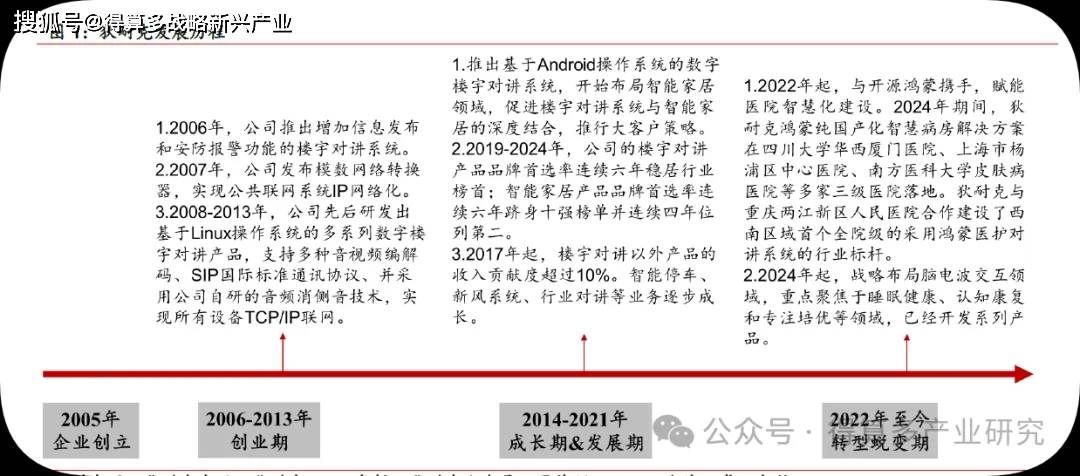 公司发展历程可以分为四个阶段。(1)2006-2013 年,创业期:公司推出增加信息发布和安防报警功能的楼宇对讲系统,先后研发出基于Linux 操作系统的多系列数字楼宇对讲产品。(2)2014-2021 年,成长期&发展期:推出基于Android 操作系统的数字楼宇对讲系统,开始布局智能家居领域,促进楼宇对讲系统与智能家居的深度结合,推行大客户策略。2019-2024 年,公司的楼宇对讲产品品牌首选率连续六年稳居行业榜首;智能家居产品品牌首选率连续六年跻身十强榜单并连续四年位列第二。(3)2022年至今,转型蜕变期:2022 年起,公司与开源鸿蒙携手赋能医院智慧化建设;2024 年期间,狄耐克鸿蒙纯国产化智慧病房解决方案在四川大学华西厦门医院、上海市杨浦区中心医院、南方医科大学皮肤病医院等多家三级医院落地。2024 年,战略布局脑电波交互领域,重点聚焦于睡眠健康、认知康复和专注培优等领域,目前,公司脑电波领域的睡眠健康产品,初步完成智能睡眠仪、脑波睡眠监测仪、脑机睡眠调理仪等产品的试产工作。