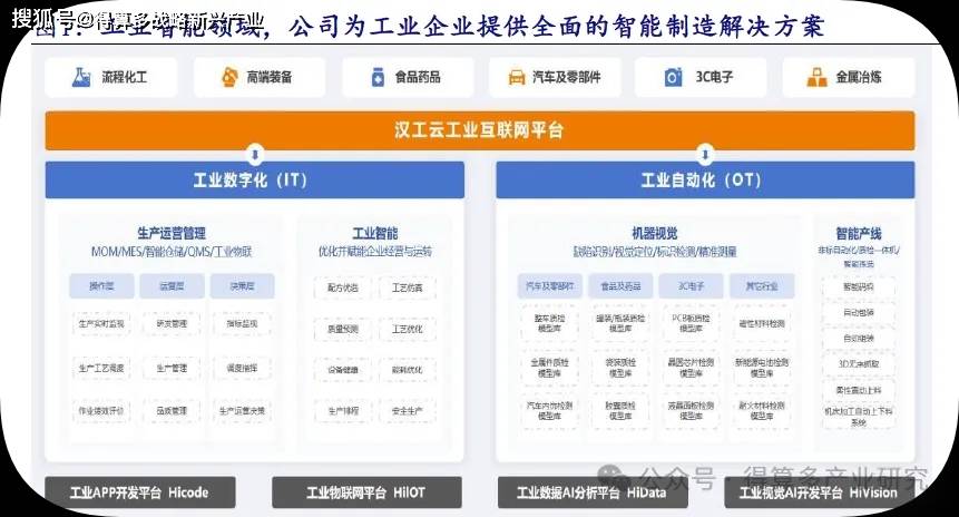 依托工业数据 AI分析平台和工业视觉 AI开发平台,研发了“ AI+工业视觉”、AI+数字工厂”两款基于客户场景的产品及解决方案,在自有产品和解决方案的基础上打造以人工智能技术为核心的“汉工云”工业 互联网 平台,联合生态伙伴共同构建“ AI+X”产业赋能生态,实现 AI+工业”在各行业领域的产业落地。目前已服务于流程化工、高端装备、食品药品、汽车及零部件、 3C电子、金属冶炼六大行业千余家客户。