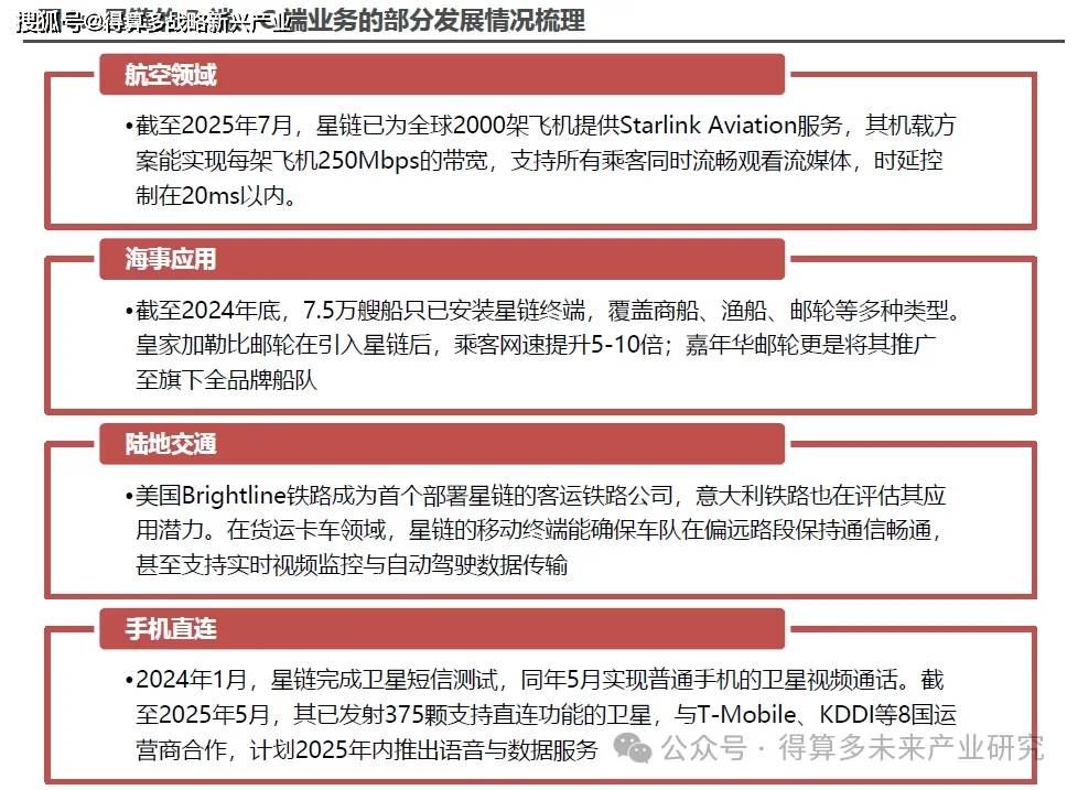 参考星链的B端、C端业务的发展,未来卫星互联网在长距离、低时延场景下具有重要潜力。在商业与行业应用领域,星链凭借低轨网络的移动性优势以及在时延方面的优势,在航空、海事、陆地交通等场景实现快速发展。