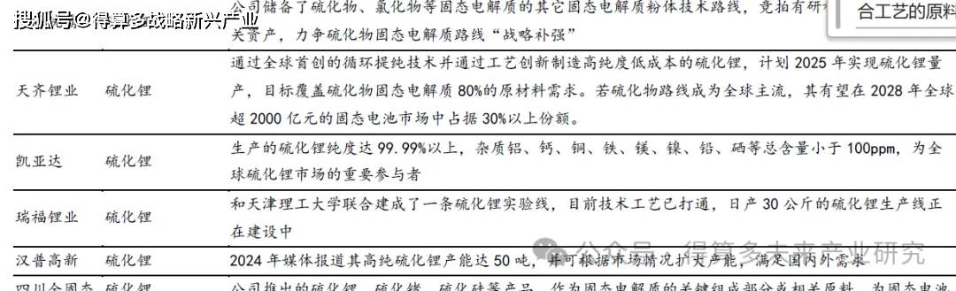 硫化锂/硫化物电解质参与玩家已较多。锂电龙头企业率先构建产业矩阵,典型代表包括赣锋锂业、天齐锂业、容百科技、恩捷股份等;初创企业快速涌现,如深圳固研、广州博粤、中科固能等;半导体领域企业基于硫化物半导体领域的技术协同效应,逐步延伸至硫化锂等核心材料供应链,如杭州凯亚达、四川全固态等。