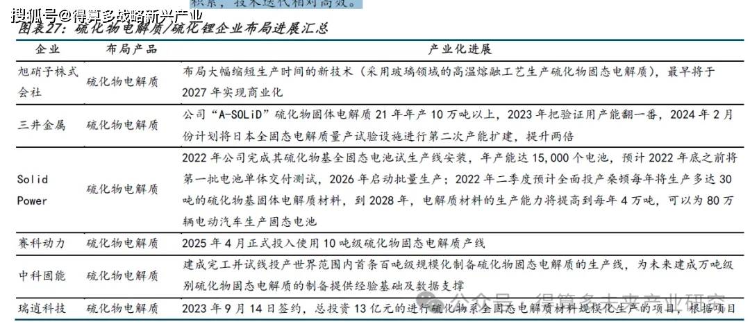 1)硫化物电解质企业:初创企业居多,国内代表企业包括中科固能、恩力动力、天赐材料、广州博粤等。其中中科固能建成完工并试线投产世界范围内首条百吨级规模化制备硫化物固态电解质的生产线,为未来建成万吨级别硫化物固态电解质的制备提供经验基础及数据支撑;恩力动力2018 年与软银成功开发出了使用硫化物固态电解质及锂金属负极的全固态锂金属电池,掌握低成本的硫化物电解质制备技术;天赐材料开发出了硫化锂路线的固态电解质,并成功完成实验室公斤级生产,目前处于中试阶段,计划于2025 年实现小批量生产;广州博粤攻关硫化物固态电解质(如Li6PS5Cl,Li10GeP2S12 等)公斤级批量化制备工艺,通过优化前驱体处理、固相反应条件及后处理工艺,成功开发出可重复性高、适用于公斤级制备的技术路线。