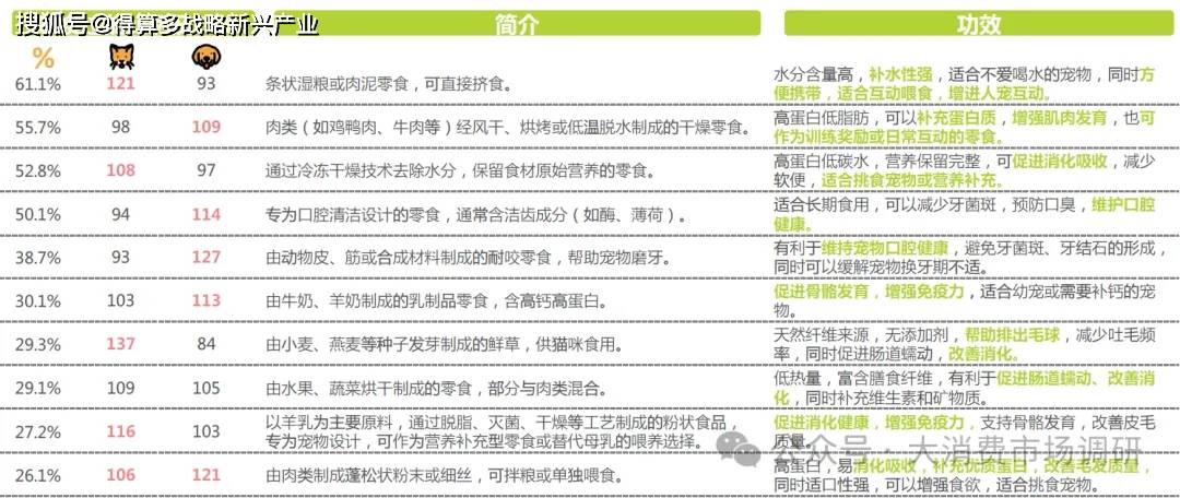 宠物主粮是宠物食品中最大的子赛道,主要包括湿粮和干粮两大类型,过半宠主都给宠物喂食过罐头/软包装湿粮,而冻干粮和烘焙粮也是宠主的主流选择,这反映出宠主对高适口性和健康配方的需求。另外,随着宠主科学喂养意识的提升,处方粮和羊奶等功能性的主粮产品也逐渐普及。细分宠物类型发现,猫主更倾向选择羊奶、冻干粮,凸显其对便捷性与营养保留的偏好;狗主则更多喂食人类剩下的饭菜,这与宠物的饮食习惯或“人宠同食”的喂养理念相关。
