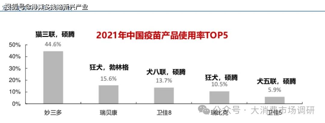 宠物疫苗的使用多依赖宠物医生的推荐,外资品牌经过多年对宠物医生的教育和培训,使得宠物医生更加愿意推荐外资品牌,2021年使用率排名前五的宠物疫苗品牌均为外资品牌,其中硕腾的猫三联疫苗妙三多处于绝对领先地位。