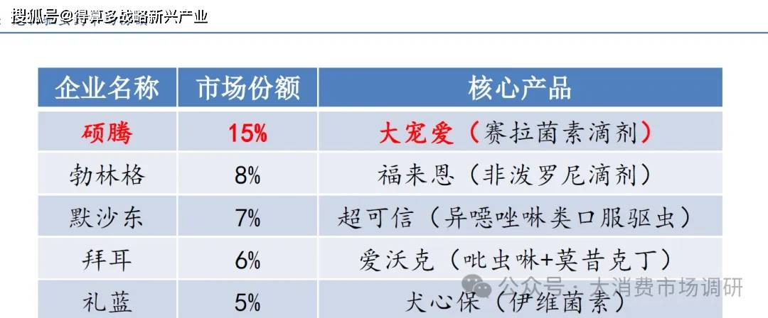 宠物驱虫药:宠物动保板块占比最大的(55%以上),硕腾的三大驱虫药:爱波克(年销售额7.7亿美元)、欣宠克(年销售额7.76亿美元)、大宠爱(年销售额5亿美元)。