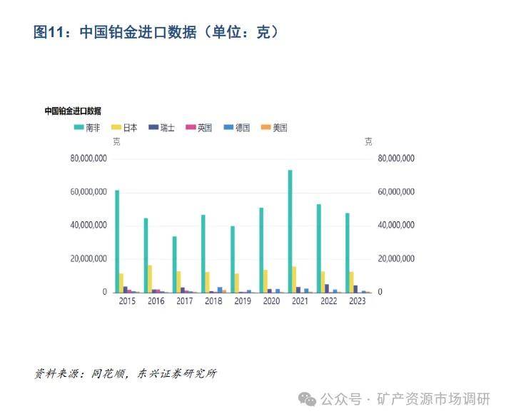 中国铂系金属进口依赖度达86.5%。2023年中国铂金进口约101.8吨,是中国2023年铂金需求量的1.79倍,进口依赖度86.5%(2023:供给:矿产3吨,回收4.68吨,共计7.68吨;需求缺口49.3吨,需求56.98吨)。从进口国家观察,南非及日本进口占比下滑但俄罗斯进口占比明显攀升。南非依旧是中国铂金进口的主要来源国家,2023年中国从南非进口铂金约47.7吨,占总进口量比重约46.9%(2021:64.9%,2022:61.4%);日本此前是中国铂金第二大进口国,2023年进口约12.7吨,占比12.4%(2021:13.8%,2022:14.8%)。此外,由于海外市场限制制裁俄罗斯铂族金属出口,我国在2023年加大了从俄罗斯的铂族金属进口,年度进口俄罗斯铂金数量是2022年同期的2.8倍,从9.0吨增加到了25.1吨,占总进口量比重由10.4%升至24.7%。