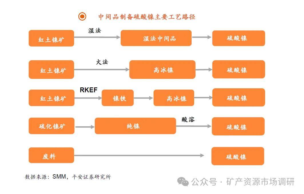 红土镍矿 硫化镍矿 湿法冶炼中间品 硫酸镍为镍产业链主线之一 近年来三元电池应用空间打开 硫酸镍需求高速增长 同时上游中间品冶炼技术变革加速 形成了当前多条技术路径制备硫酸镍并存的格局 。