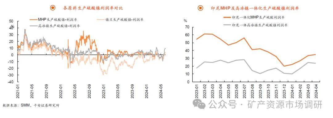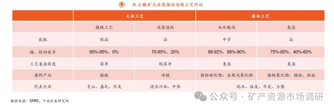 湿法冶炼投资成本湿法比火法冶炼高近 30 但生产成本上湿法相对火法有一定优势 。 1 原料端 。 高压酸浸工艺选取褐铁矿层 镍品位在 0 8 1 3 。 火法选取品位相对较高的残积层 通常在 1 5 3 。 低品位享有一定成本优势 。 2 辅料及能源 。 火法能耗显著较高但辅料成本相对低 因此受煤炭及电力价格波动影响较大;湿法冶炼能耗较低 但耗酸量大 辅料成本扰动主要来自硫酸 。 由于消耗侧重不同 未来可能会受相关物料价格波动影响产生较大差异 。 当前来看 MHP 对于一体化的企业来说仍为最经济性选择 。
