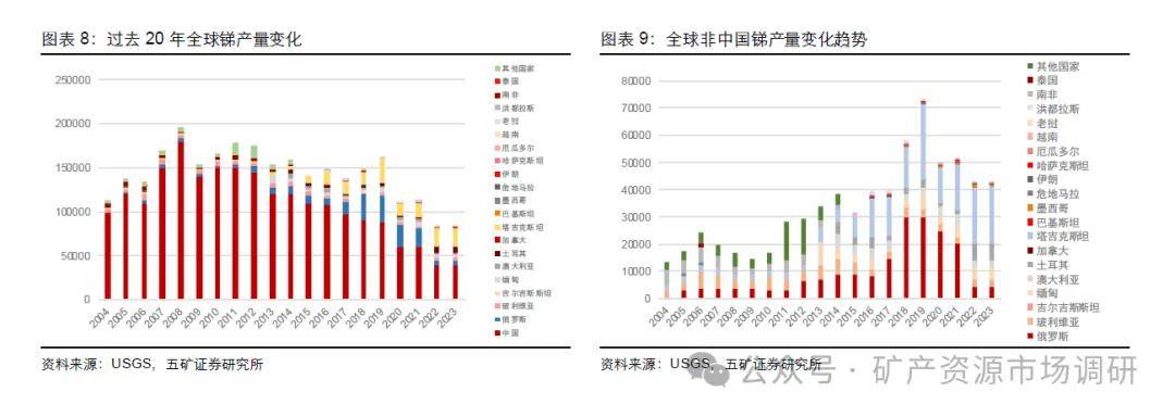 全球产量过去十年呈现下降趋势,主要因我国锑产量逐步下台阶。复盘锑产业的二十年产量趋势,全球锑产量从2004 年11.3 万吨,攀升到2008 年19.7 万吨,随后产量整体下降到2017 年13.7 万吨。2018、2019 迎来了两年的反弹后,全球锑产量再下台阶,从20 19 年16.2 万吨下降到2020 年11.1 万吨,2023 年全球锑产量回落到8.3 万吨,较历史高点下降57%。从结构中看,主要因我国锑产量大幅下降导致,我国锑产量较2008 年高点下降77%。